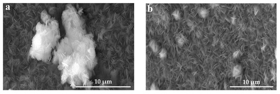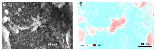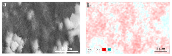Analyzing Figure 3a allows us to conclude that the surface of the Ni(OH)2-pure sample was covered by highly branched Ni(OH)2 particles. A more interesting picture is seen for the cycled electrode—Figure 3b. The hydroxide that covers the NF turned black. At the same time, a few particles that had a highly branched morphology were still green. This fact can be explained by the high resistance of particle roots and the long route of the current. More likely, the particle roots had a low cross-sectional area (S) and according to Equation (3), the resistance (R) was high enough to cause a very high IR-drop as well. A high IR-drop value will lead to an inability to conduct the electrochemical process in remote parts of the branched particles.