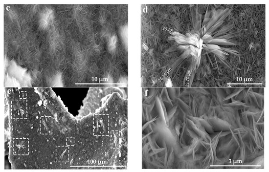 At higher magnifications, the surfaces of all the electrodes consist of flakes with nanosized thickness—Figure 5a–d. The electrode that was chemically activated with cobalt hydroxide differs in comparison with the other samples. Except for the nanoflakes, the surface contains flower-like crystals with nanosized thickness—Figure 5d–f. In Figure 5e, the flower-like crystals are highlighted by a dotted line.