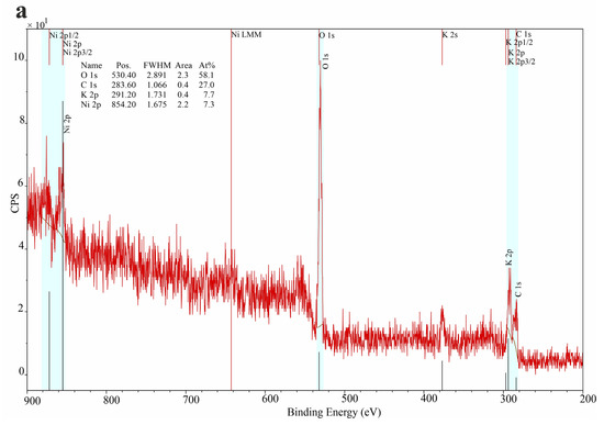 For analyzing the composition of the films formed on the substrates, an XPS analysis was carried out—Figure 7. Depending on the formation method, the electrode composition consisted of potassium, oxygen, carbon and cobalt. The electrodes activated with cobalt hydroxide contained cobalt. It was the most interesting to analyze the changes in the carbon content. In the Ni(OH)2-pure sample, the carbon percentage was estimated at 27%. After using PVP during the electrode formation, the carbon percentage rose to almost 40%. However, in the case of further cobalt activation by two methods, the carbon content decreased to 12.1 and 22.6% for electrochemical and chemical activation, respectively. This can be explained by a chemicalism of the processes. It is well-known that potassium alkaline intensively absorbs carbon dioxide, according to Equation (9):