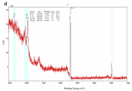 The Ni(OH)2-PVP-Co-elchem samples were obtained through the modification of the Ni(OH)2-PVP samples. After the Ni(OH)2 formed on the NF surface, the samples were modified by the electrochemical deposition of cobalt hydroxide at a constant current from 0.1 M of the Co(NO3)2 solution. The electrodeposition was achieved by applying a constant cathodic current for 1 h. A specific current was calculated based on the Ni(OH)2 mass in order to deposit 20% cobalt hydroxide by mass. For example, if the Ni(OH)2 mass was 20 mg, the applied current was 2.31 mA (i.e., j = 0.116 mA/mg(Ni(OH)2)). After the electrodeposition, the electrodes were rinsed, dried and weighed as described above.
