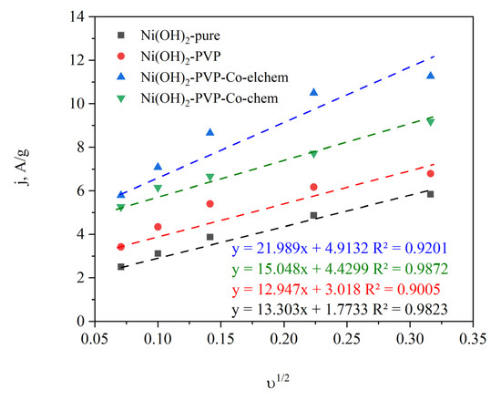 where n is the electron number of the reaction (1 for Ni(OH)2, Equation (1)), S is the surface area of the electrode, D is the diffusion coefficient of the protons (Equation (1)), υ is the sweep rate and C0 is the initial concentration of the diffused ions H+.