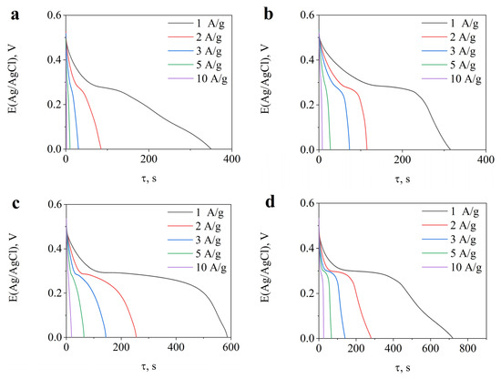 The discharge curves for the samples are shown in Figure 10. The analysis of the presented curves revealed that the first step of the nickel hydroxide formation and the second step of the activation by cobalt affected the parameter curves—shapes, potentials and discharge times. The highest times of discharge were detected for the Ni(OH)2-PVP-Co-chem sample. Based on the discharge curves, the dependencies between the specific capacitance and capacity and the specific current density were calculated—Figure 11.