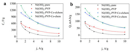 Specific capacitance (a) and capacity (b) and the specific current density dependencies for electrodes mass loadings were Ni(OH)2-pure—18.7 mg; Ni(OH)2-PVP—19.8 mg; Ni(OH)2-PVP-Co-elchem—17.3 mg; Ni(OH)2-PVP-Co-chem—13.3 mg.