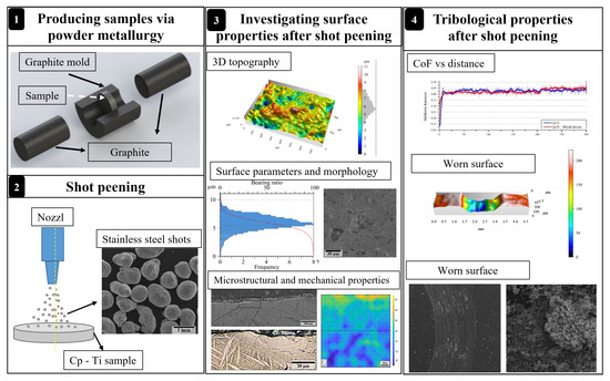 Figure 1 depicts an outline of the present study. Briefly, Cp-Ti samples were manufactured using powder metallurgy and were then shot-peened. Optical profilometry and scanning electron microscopy (SEM) were used to evaluate the surface properties of shot-peened and unpeened samples. Additionally, cross-sectional microstructures and hardness maps of shot-peened samples were examined to reveal the influences of shot peening on microstructural and mechanical properties. Finally, ball-on-disc tests were conducted to determine the tribological properties of shot-peened Cp-Ti samples, and a detailed surface analysis of the worn samples was conducted.