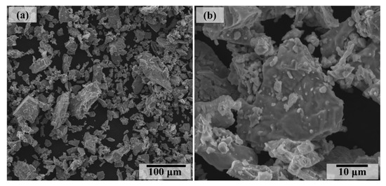 SEM images of Ti powder particles at low (a) and high (b) magnification indicating irregular morphology.