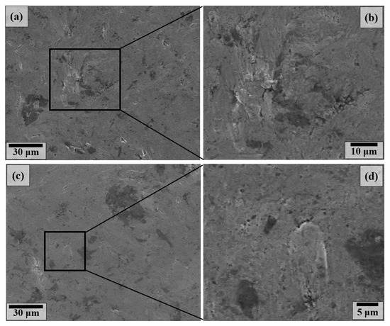 SEM images of shot-peened Cp-Ti surface at low magnification (a,c) and at high magnification (b,d).