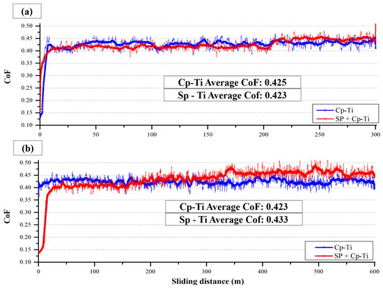 Coefficient of friction versus sliding distance of shot-peened (SP+Cp-Ti) and unpeened (Cp-Ti) at sliding distance of 300 m (a) and of 600 m (b).