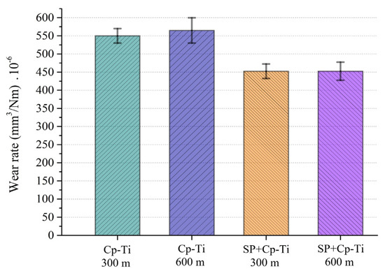 Specific wear rate of shot-peened (SP+Cp-Ti) and unpeened (Cp-Ti) at sliding distances of 300 m and 600 m.