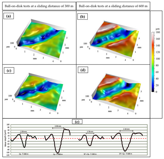The mean CoF curves versus sliding distance for shot-peened (SP+Cp-Ti) and unpeened (Cp) surfaces (Figure 7) illustrate two stages: a running-in stage and a steady-state stage. At a sliding distance of 300 m, the running-in stage for both shot-peened and unpeened surfaces occurred approximately within the first 10 m. In contrast, a shorter running-in stage was observed for the unpeened surfaces at a sliding distance of 600 m, whereas the running-in stage for the shot-peened surfaces ended around 10 m. During the running-in stage, CoF rapidly increased in all cases, attributable to the small contact area [37]. Once the steady-state stage was established, the CoF remained relatively stable until the end of the tests. The mean CoF for shot-peened and unpeened surfaces at a sliding distance of 300 m were 0.423 ± 0.03 and 0.425 ± 0.04, respectively. Similar values were recorded at a sliding distance of 600 m (mean CoF 0.433 ± 0.03 for shot-peened surfaces and 0.423 ± 0.05 for unpeened surfaces). These findings indicate that the effect of shot peening was limited over CoF. In addition, all surfaces showed a stable steady-state stage regardless of changes in sliding distance.