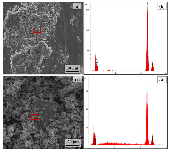 SEM image of worn shot-peened surface at a sliding distance of 600 m (a) and corresponding EDS analysis (b); SEM image of wear debris particles (c) and corresponding EDS analysis (d). Red frames show the region of interest for EDS analysis.
