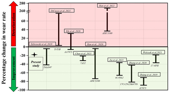 Comparison of percentage change in wear rate with literature [16,17,18,20,21,22,25,29,30,32] (details in Supplementary Materials).