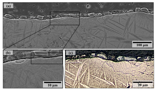 The peened material has a work-hardened layer (as evidenced by hardness mapping, Figure 17) that slowed down material removal and plastic deformation during contact. In addition, optical and SEM cross-sectional images of shot-peened Cp-Ti samples prior to wear testing reveal the surface deformation and modification of subsurface microstructural features (Figure 18). Since the sintering temperature (950 °C) was above β transus, the resulting microstructure consists primarily of acicular α‘martensite and coarse elongated α grains due to the insufficient cooling rate during the β→ α transformation (Figure 18a). Although an ultrafine-grained layer (i.e., nanostructured gradient layer) is formed just beneath the surface down to a depth around 20 µm (Figure 18a), it is not possible to clearly visualize and determine the average grain size of this layer due to the insufficient resolution of the microscopy techniques used. However, the cross-sectional hardness map of shot-peened Cp-Ti samples (Figure 17) reveals a sharp increase in hardness in this region, indicating that shot peening significantly modifies the near-surface microstructure, resulting in an increase in wear resistance, as previously demonstrated (Figure 14). To the authors’ knowledge, the present study is the first to demonstrate the increase in hardness of shot-peened materials in 2D via hardness mapping, thereby elucidating why the wear resistance of shot-peened materials is superior to that of unpeened materials.