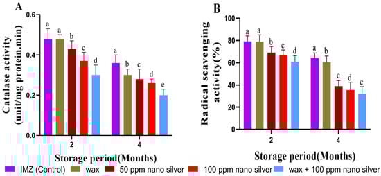 The response of catalase enzyme activity in Murcott mandarin to various postharvest treatments, regardless of the cold storage period, is displayed in Figure 1A. The results showed that the highest catalase enzyme activity was found in the control (imazalil) and wax, compared with other remaining treatments. The combined wax—100 ppm nanosilver showed the lowest activity of catalase enzymes.