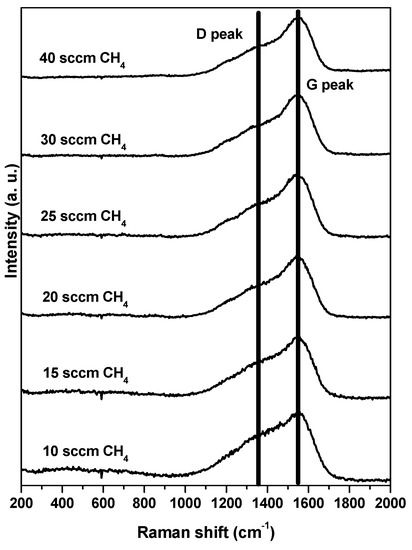 - Libardi, J.; Grigorov, K.; Massi, M.; Otani, C.; Ravagnani, S.; Maciel, H.; Guerino, M.; Ocampo, J. Comparative studies of the feed gas composition effects on the characteristics of DLC films deposited by magnetron sputtering. Thin Solid Films 2004, 459, 282–285. [Google Scholar] [CrossRef]