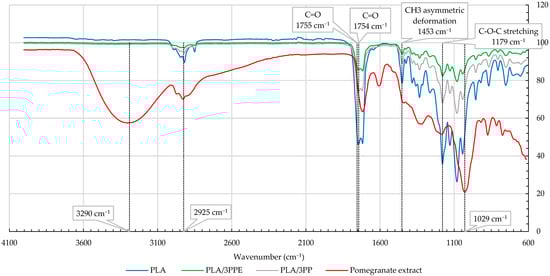 FTIR spectrum of the pomegranate extract (PPE-FD), control (PLA), and active films (PLA/3PPE and PLA/3PP).