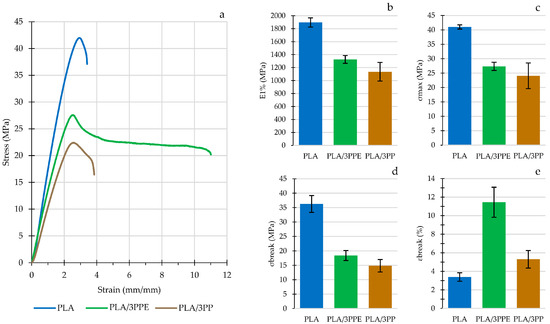 The tensile test results can be seen in Figure 3 in MD. The sample with the highest modulus and strength was the neat PLA. The values of the tensile test results relative to the other samples are much lower except for the percentage of deformation at the break, which increased considerably for the PLA/3PPE sample. It seems that the introduction of low-mass molecules acts as a slip agent, allowing the polymer molecules to move, which increases the plastic region of the material. The incorporation of both pomegranate extract and peel clearly translates into a loss in stiffness.