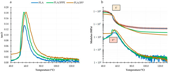The storage modulus and loss factor of the films were assessed by dynamic mechanical analysis (DMA) using a DMA TRITON, with a 10 mm distance between grips, in tensile mode. For this test, samples with a 4 mm width were used, and a load of 1 N was applied at a frequency of 1 Hz in the temperature range of 40 to 130 °C using a heating rate of 2 °C/min. The tensile tests were performed on a mechanical testing machine, INSTRON 5969, with a load cell of 50 kN, at a speed of 100 mm/min, at 23 ± 2 °C, following ASTM D882—02. At least five film specimens, with a length of 160 mm and a width of 25 mm, were used. In both tests, samples were cut in the machine direction (MD).