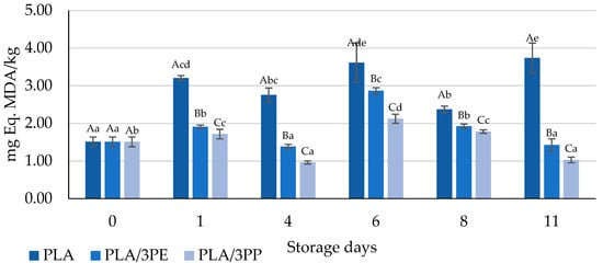 Results of the TBARS assay of the beef meat packaged with the control (PLA) and the active (PLA/3PPE and PLA/3PP) films. The uppercase letters compare the same packaging for different storage days. Different letters, for either lowercase/uppercase comparison, represent results with significant differences.