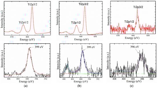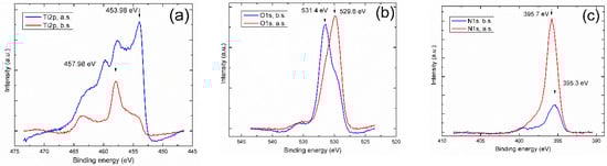 For the Ti2p window shown in Figure 10a, before sputtering, the BE of Ti2p3/2 can be associated with a nonstoichiometric native oxide Ti oxide, as the metallic state is discarded. After sputtering, that Ti2p3/2 signal can be associated with an oxynitride phase. In addition, it a tendency of the BE to become lower can be observed, from 457.98 to 453.98 eV when Ti tends to nitridize. For the O1s window of Figure 10b, the BE before sputtering can also be related to native oxide. After sputtering, O1s can be related to an oxynitride phase. For the case of O1s, the BE before sputtering (531.5 eV) closely agrees with the reported value of the native oxide phase [25]. Conversely, this is not the case for the oxynitride phase, due to the wide variety of substoichiometric TiNxOy phases with different contents of O and N, which can turn into several variations in the chemical state and therefore into BE values. For N1s in Figure 10c, the BE change is not significant before and after sputtering. Thus, those signals can be related to the oxynitride phase. From the calculated atomic concentrations of Ti, N and O, extracted from the XPS spectra after sputtering, the empirical formula of the film was Ti0.37N0.41O0.21.