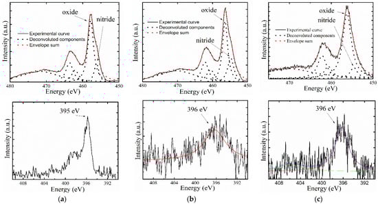 In Figure 2, a convolution of oxide/nitride states, for the Ti2p transition, can be observed. In the figure, deconvoluted curves for both states are included. Oxide and nitride states are clearly differentiable, both in binding energy and in the shape of the transition. The shape of the Ti in the nitride state is modified because of the generation of satellites (caused by the extra conduction electrons) to the left of each transition, which produce asymmetry [11,14]. In Figure 1, a more symmetric shape in the Ti2p transition can be noted. Again, in Figure 2, the BE of Ti-oxide appears at 457–458 eV, while BE of Ti-nitride is about 1 eV lower, at 454–456 eV. This is expected, as the oxidized state tends to be more stable. The values of BE detected in our samples agree with the ones reported in the literature for oxide/nitride [12,13,15,16,17]. No oxy-nitride signal was detected in the Ti2p window, which is very distinguishable between the Ti-oxide and Ti-nitride and which appears at the middle in energy value [17,18]. In addition, metallic states of Ti were discarded. The assignation of the chemical states of samples was also supported by additional XPS analysis of the Ti and TiN targets, which are included in the Supplementary Materials.