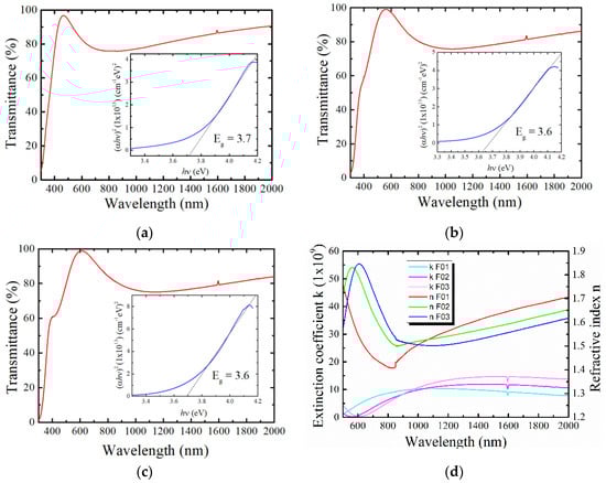 The transmittance curves obtained from the UV–Vis measurements are included in Figure 3 for samples F01, F02 and F03, together with the Tauc curves at inset, and the n, k vs. λ of all samples in one graph. Figure 4 includes the transmittance curves for samples F0405 and F0607.