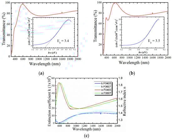 Transmittance spectra for samples (a) F0405 and (b) F0607. Tauc curves are included in inset; (c) n and k vs. wavelength curves for the two samples.