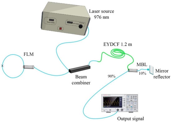 For pulsing to occur, the SA accumulates a large amount of energy supplied by the pumping source, until saturation overflow is reached, leading to a release of energy in the form of a pulse of the order of microjoules. The experimental setup is a linear cavity laser containing an Er/Yb-doped double-clad fiber (EYDCF) with a length of ~1.2 m (DCF-EY-10/128, CorActive, Québec, QC, Canada), with a core absorption of 85 dB m−1 at 1535 nm and inner cladding absorption of 2 dB m−1 at 915 nm), which functions as a gain medium. The EYDCF pumps with a high-power 25 W laser at 976 nm, and the light beam passes through of a 2 × 1 + 1 combiner that allows for the passage of wavelengths at 976 and 1550 nm at the same time. On one side of the cavity is a fiber loop mirror (FLM) that consists of a 50/50 coupler with its output ports connected, which is used as a mirror capable of reflecting 100% of the incident light. At the other end is a 90/10 coupler from which the 10% output port was connected to an MBL fiber that is fixed horizontally to the base, with a flat mirror to the front. The 90% output port was the output of the laser signal and where the data measuring the pulsations were detected with the help of a photodetector, of which were read by means of an oscilloscope. Figure 5 shows the laser setup.