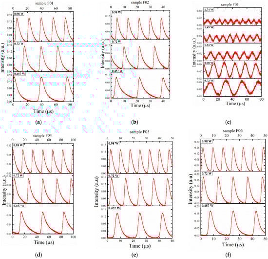 The characteristics of the generated PQS laser pulses are shown in Figure 6, where it can be seen that all the samples maintain stability in the pump power range of 0.457 to 0.98 W, except in sample F03, in which unstable pulses were observed, attributed to the lack of available conduction electrons, since this sample had a lower amount of Ti (see Table 1). We think that this factor, and not the diameter of the optical fiber, explains this behavior.