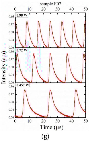 Train of PQS pulses of the laser at different pump powers for the different MBL samples: (a) sample F01, (b) sample F02, (c) sample F03, (d) sample F04, (e) sample F05, (f) sample F06, (g) sample F07.