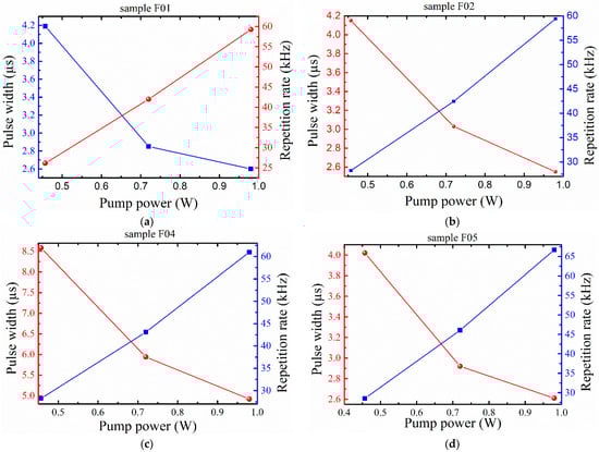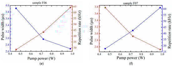 Pulse width and repetition rate of the PQS pulses as a function of the pump power of MBL sample: (a) sample F01, (b) sample F02, (c) sample F04, (d) sample F05, (e) sample F06, (f) sample F07.