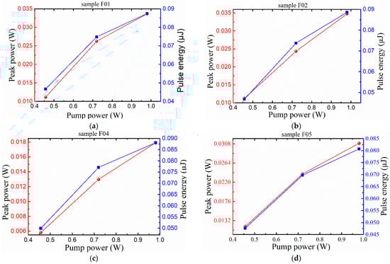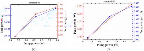Peak power and pulse energy of the PQS pulses as a function of the pump power of all MBL samples. (a) sample F01, (b) sample F02, (c) sample F04, (d) sample F05, (e) sample F06, (f) sample F07.