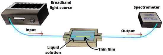 In order to characterize the sensitivity of the fiber structure to refractive index variations of a liquid medium surrounding the coated fiber, the experimental setup of Figure 11 was used. The fiber structure was fixed between the holders of a mechanical device, and then, the NCF was immersed in liquid solutions from a set with different refractive indices. A broadband NIR LED source with emissions in the range of 1400 to 1700 nm was used as the input light source. The transmitted optical spectrum was measured to determine the characteristics of the output light by using a NIR spectrometer with a wavelength range from 970 to 1700 nm.