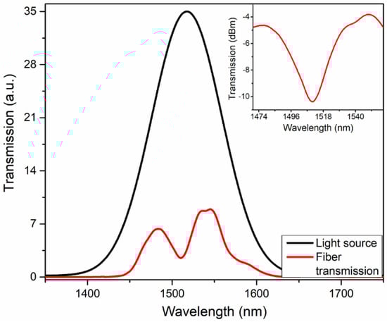 The measurements of the output transmitted signal and the transmission of the coated fiber are shown in Figure 12. The spectrum of the input light source (black line) was directly obtained with the source connected to the spectrometer. As can be observed, the spectrum of the broadband source spans from ~1400 to ~1650 nm. The spectrum of the transmitted light through the fiber (red line) exhibits a transmission notch at 1512.3 nm. The inset of Figure 12 shows the transmission calculated as the division of the transmitted signal over the input light signal, shown in dBm units. The results were obtained for the NCF structure submerged in a solution with a refractive index of 1.36. The observed transmission notch corresponds to the second LMR order, which exhibits a depth of ~6 dB.