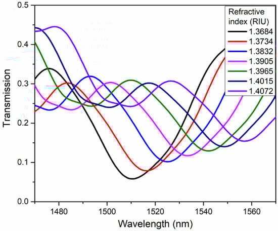 The characterization of the wavelength displacement of the transmission notch as a function of the variations on the refractive index of the liquid medium surrounding the coated fiber is shown in Figure 13. As can be observed, with the increase in the refractive index of the surrounding medium, the transmission notch displaces toward longer wavelengths as the depth of the notch decreases.