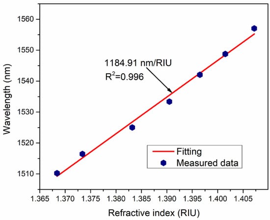 From the results obtained in Figure 13, the characteristic curve of the refractometer is obtained by wavelength displacement interrogation, as shown in Figure 14. As it can be observed, the results can be fitted to a linear function with R2 of 0.996. The sensitivity, obtained from the slope, is 1184.91 nm/RIU in a refractive index ranging from 1.3684 to 1.4072.