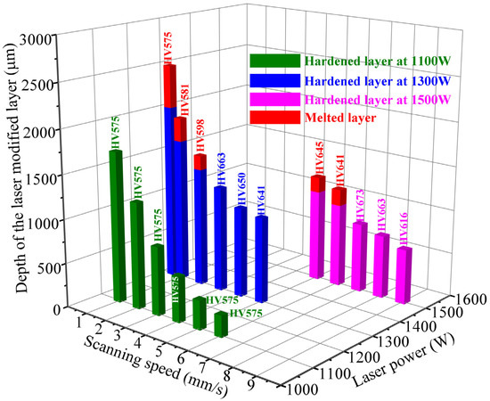 Surface hardness and depth of the laser modified layers obtained at different laser powers with different scanning speeds.