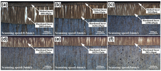 The LSE are carried out at different laser powers (1100 W, 1300 W and 1500 W) with different scanning speeds (0.5~9 mm/s). Surface hardness and depth of the laser modified layers are summarized in Figure 1. It can be seen that 1300 W (65% of the maximum laser power) is an appropriate laser power for investigating the influences of laser surface melting (LSM) and laser surface hardening (LSH) due to the suitable surface hardness and depth of the modified layers formed at this power with scanning speed from 0.5 to 5 mm/s. Cross sectional observations of the samples laser surface treated at 1300 W are conducted on an optical microscopy (OM, ZEISS AXIO Observer A1m), and the results are shown in Figure 2. It can be seen that the depth of the laser-modified layer increases with decreasing scanning speed. Surface melted layers are observed in Figure 2a–c, indicating that low scanning speed (≤2 mm/s) leads to the occurrence of surface melting. In Figure 2d–f, only the hardened layers are observed, indicating that surface melting is avoided with a high scanning speed (≥3 mm/s). Therefore, LSE treatments at 1300 W with scanning speed lower than 2 mm/s and higher than 3 mm/s are named as LSM treatment and LSH treatment, respectively, in the present work. The microstructures and surface properties of the representative samples with scanning speed of 2 mm/s and 4 mm/s are characterized in detail to analyze the effect of LSM and LSH treatment. After LSE treatment, the chemical composition of the surface layers of the LSM-2 mm/s and LSH-4 mm/s samples are measured using the optical emission spectrometer (Thermo Fisher Scientific ARL 4460) again, and the results are also listed in Table 1.