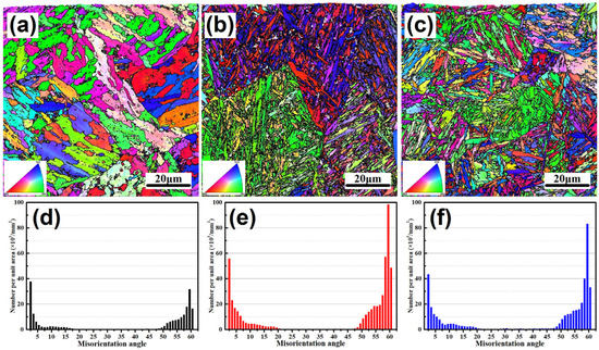 The microstructures in the surface layer play an important role in the surface performance of the materials. Therefore, microstructure characterizations are mainly focused on the surface layers of the LSE processed samples. The microstructures in the surface melted layer of LSM-2 mm/s sample and in the surface hardened layer of LSH-4 mm/s sample are compared with the initial microstructure of the AR sample, as shown in Figure 3a–c. As seen, the martensite formed in the laser-modified layer is much finer than the initial microstructure. This point is further confirmed by the statistical results of boundary density, which is plotted as the number of boundaries per unit area versus misorientation angle, as shown in Figure 3d–f. The number of boundaries with low misorientation angle (2–15°) and high misorientation angle (>50°) are greatly increased in LSM-2 mm/s and LSH-4 mm/s samples, indicating the refinement of microstructure caused by LSE treatment. As well known, the increasing boundary density can greatly improve the strength and hardness, which has a positive effect on the wear and thermal cracking resistance of the materials [22,23]. Therefore, the wear and thermal cracking resistance of the surface layer are expected to be significantly improved by LSE treatment.