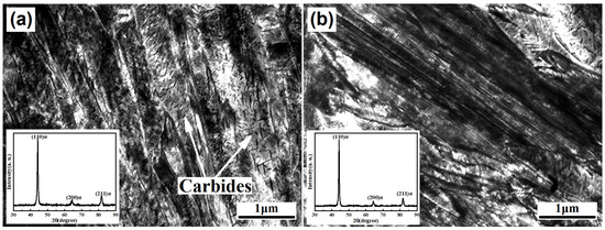 The microstructures are further observed in detail by TSEM in order to obtain their structural information at high magnification. As shown in Figure 4a,b, lath-type martensite is observed both in the melted layer of LSM-2 mm/s sample and in the hardened layer of LSH-4 mm/s sample. In the XRD patterns embedded in Figure 4, all diffraction peaks correspond to α-Fe. Residual austenite is not detected by XRD analysis and TESM microstructure observation in these two types of samples. In the melted layer of LSM-2 mm/s sample, a certain amount of acicular carbides are precipitated in the martensite laths, as highlighted in Figure 4a. Nevertheless, the precipitation of carbides are not found in the hardened layer of LSH-4 mm/s sample in Figure 4b. The remarkable auto tempering effect can account for the precipitation of carbides in LSM-2 mm/s sample. Long irradiation time of laser beam on the sample surface caused by low scanning speed increases heat input to the sample surface [24]. The increase of heat input not only leads to the melting of the surface material, but also increases the time required for the modified layer to cool to room temperature. Hence, the autotempering effect is more pronounced at low scanning speed [25], giving rise to the precipitation of carbides in the melted layer of LSM-2 mm/s sample.