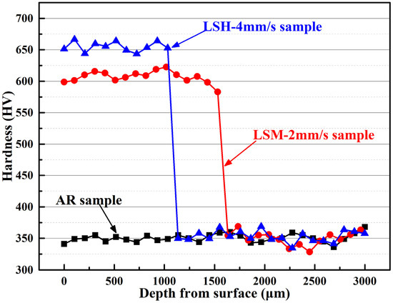 Hardness profiles versus depth of the AR sample and LSE processed samples.