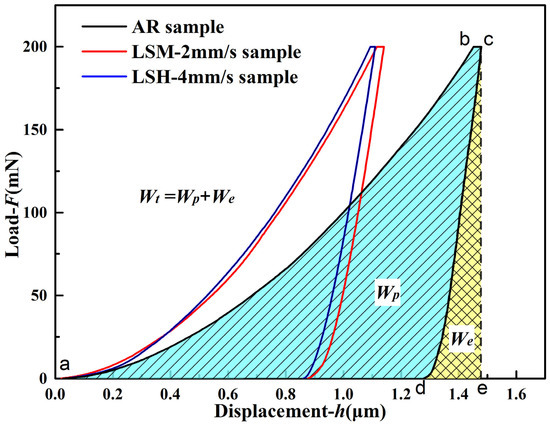 The mechanical behavior of the P20 substrate and laser-modified layers are estimated by the load-displacement (F-h) curves, which are recorded during indentation hardness tests. F is the load applied during the test, while h is the depth of the indenter penetrated into the sample surface. As marked on the curve of P20 substrate in Figure 6, the load-displacement curve includes three segments: loading (a-b), holding (b-c) and unloading (c-d). The relationship between load F and indenter displacement h during the loading segment can be described as F = C × h2, where C is the loading curvature. According to the literature [26], a high value of C represents the excellent resistance of the material to indentation. The values of C determined by data fitting are 97.26, 163.44 and 169.71 mN/μm2 respectively for P20 substrate, surface melted layer of LSM-2 mm/s sample and surface hardened layer of LSH-4 mm/s sample. It can be deduced that the indentation resistance increases in the order of AR sample, LSM-2 mm/s sample and LSH-4 mm/s sample. In addition, some researchers [27] have proposed that the plastic deformation resistance of materials can be evaluated by plasticity factor , which is equal to the ratio of plastic deformation work to the total deformation work . is the sum of plastic deformation work and elastic deformation work , as shown in Figure 6. A small plasticity factor indicates great resistance to plastic deformation. The value of for the P20 substrate, top surface layers of LSM-2 mm/s sample and LSH-4 mm/s sample is 0.85, 0.76 and 0.74, respectively. It is evident that LSM-2 mm/s and LSH-4 mm/s samples exhibit superior plastic deformation resistance compared with AR sample.
