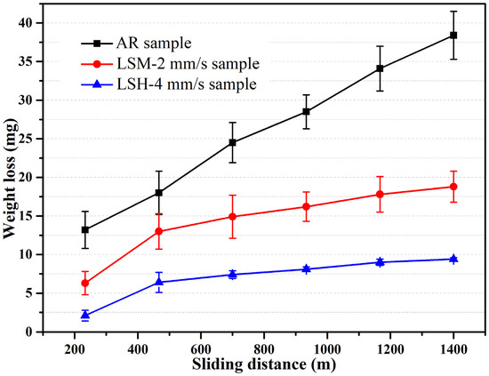 The weight loss curves of AR, LSM-2 mm/s and LSH-4 mm/s samples are shown in Figure 7. The weight loss after a sliding distance of 1400 m is 38.4 mg for AR sample, whereas this value decreases to 18.8 mg and 9.4 mg for the LSM-2 mm/s sample and LSH-4 mm/s sample, respectively. High weight loss of AR sample manifests the poor wear resistance due to its low surface hardness. Compared with the AR sample, LSH-4 mm/s sample exhibits about 75.5% reduction in weight loss, indicating a significant improvement in wear resistance. LSM treatment with scanning speed of 2 mm/s also improves the wear resistance to some extent. However, the weight loss of LSM-2 mm/s sample is slightly higher than that of the LSH-4 mm/s sample. It can be inferred that the wear resistance of the samples increases in the order of AR sample, LSM-2 mm/s sample, LSH-4 mm/s sample. This is in accordance with the surface hardness of these samples. High surface hardness is recognized as a favorable factor for the material to resist the wear and tear [28,29]. The formation of martensite with high hardness in the surface layer endows P20 steel with excellent wear resistance.