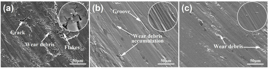 As noted in connection with Figure 7, the weight loss of these samples exhibits different trends with the increasing sliding distance. The weight loss of AR sample increases linearly with sliding distance. By contrast, the weight loss curves of LSM-2 mm/s and LSH-4 mm/s samples can be segmented into two stages. The initial stage (sliding distance ≤ 470 m) with a high wear rate is in the fretting wear stage [30]. Then, steady-state wear stage with decreased wear rate is reached when the sliding distance exceeds 470 m. The wear behavior is closely related to the wear mechanism. Therefore, the worn surfaces are observed in detail by scanning electron microscope in order to determine the wear mechanism that occurred in these samples. The representative worn morphologies are demonstrated in Figure 8. For AR specimens, plenty of debris are found with cracks and flakes on its worn surface, as exhibited in Figure 8a. The development of surface cracks is generally concerned with the accumulation of plastic deformation in surface material [31]. Hence, it can be inferred that the surface material experiences severe plastic deformation under the cyclic load. These cracks gradually grow up during repeated plastic deformation, thus leading to the detachment of surface material and resulting in a serious material loss. Large pits are developed on the worn surface resulting from the successive shedding of flakes. In the following sliding process, the crushed flakes acting as wear particles give rise to abrasive wear. Based on the above analysis, it can be deduced that successive shedding of flakes induced by surface cracks propagation accompanying with abrasive wear are the main wear mechanism for AR specimen.