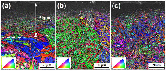 To observe the evolution of surface microstructure in the process of wear experiment, a cross sectional observation is performed on the mid region of wear trace using EBSD measurement. As shown in Figure 9a, a wear induced refinement layer with a thickness of about 50 μm is formed on the surface of AR sample. By contrast, relatively thin refinement layers are presented in Figure 9b,c for the LSE samples. The formation of the refinement layer is generally related to the plastic deformation induced by the cyclic loading [32,33,34]. According to the results implied in Figure 6, the laser-modified layers with high hardness martensite have excellent plastic deformation resistance, whereas the P20 substrate exhibits an inferior deformation resistance. Therefore, a deeper refinement layer is found on the cross section of AR sample. The severe plastic deformation of surface material results in the formation of cracks and the shedding of flakes [35]. Then, a new plastic deformation layer will gradually generate in the subsequent wear process and fall off from the worn surface again. Consequently, a linear increase of weight loss with sliding distance is recorded for the AR sample. By contrast, the martensite with high hardness in the laser-modified layer effectively prevents the occurrence of plastic deformation. Therefore, a steady-state wear stage with decreased wear rate is reached after a sliding distance of 470 m.
