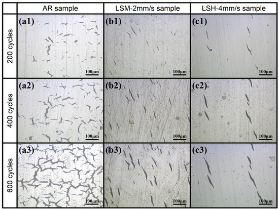 The propagation behaviors of thermal cracks in AR and LSE processed samples after different thermal cycles are illustrated in Figure 10. The surface thermal cracks in all samples grow up gradually both in length and width with the increase of thermal cycles. For AR sample, plenty of thermal cracks are formed on the surface after 200 thermal cycles. These thermal cracks propagate along irregular paths and generate branch cracks after 400 thermal cycles. With the formation of new cracks, the old cracks connect into a crack network after 600 thermal cycles, as shown in Figure 10a1–a3. The severe thermal crack network on the surface of AR sample indicates its poor resistance to thermal cracking. In contrast, the thermal cracks in LSE samples exhibit significant difference in propagation behavior. For the LSM-2 mm/s sample and LSH-4 mm/s sample, the thermal cracks formed after 200 thermal cycles are obviously less than that of the AR sample, as shown in Figure 10b1,c1. Moreover, the thermal cracks propagate in a relatively straight path after 400 thermal cycles in Figure 10b2,c2. The absence of crack intertwining in Figure 10b3,c3 indicates excellent thermal cracking resistance even after 600 thermal cycles. It is obvious that the number of thermal cracks of LSE-4 mm/s sample is minimum, indicating the greatest resistance to thermal cracking.