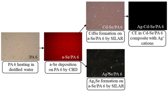 The first step involved the synthesis of Se via the CBD process. For Se deposition/insertion, the cleaned PA 6 film cuts were vertically immersed into a beaker with 0.1 M H2SeO3 and 0.15 M Na2SO3 solutions and exposed in a thermostatic vessel for 24 h at 20 ± 1 °C. The concentrations of the H2SeO3 and Na2SO3 solutions (pH 2 with the addition of H2SO4), the deposition temperature and exposure time were chosen to give excellent composites in terms of continuity, smoothness and adhesion to the substrate. The solution was clear at first, became slightly turbid after two hours and turned into a light red liquid after a few hours. The Se precipitate was very fine, but it aggregated into large clusters within ~24 h. This proposed mechanism for the formation of Se films is based on nucleation and the Ostwald ripening process [34]. The process is simple, controllable and reproducible. After the deposition/insertion of Se, the upper layer (Figure 1) was removed from the PA 6 surface with filter paper and samples were thoroughly washed with distilled water and stored in a desiccator between the individual processing steps. Then, obtained composites (referred to in the text as a-Se/PA 6) were used as the initial composite for the stepwise insertion of Cd2+ and Ag+ ions. For this, half of the a-Se/PA6 composites were treated for 3 h with 0.1 M Cd(NO3)2 solution (pH 5.4) at 80 ± 1 °C. The second half of a-Se/PA6 composites were treated for 2 h with 0.1 M AgNO3 solution (pH 6.35) at 20 ± 1 °C. The obtained composites were labelled as Cd-Se/PA 6 and Ag-Se/PA 6, respectively. Then, one part of the Cd-Se/PA 6 composites were treated for 10 min with 0.05 M AgNO3 solution (pH 6.45, 20 ± 1 °C) and washed well, as described above. After immersion into AgNO3 solution, the resulting composites (throughout the text labelled as Ag-Cd-Se/PA 6) were uniformly black and highly reflective with good adhesion. In all cases, the samples were treated in a thermostated vessel. During the deposition process, the beaker was kept undisturbed. All deposited films were evaluated for adhesion by subjecting them to a steady stream of distilled water. After each deposition step, the samples were washed first with hot and then cold distilled water, dried at ambient temperature and stored in a desiccator until analysis. Figure 1 shows a schematic outline of the approach and optical micrograph images of the PA 6 and obtained composites.