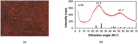 (a) Optical micrograph of the red upper a-Se layer on a PA 6 (×100 magnification); (b) XRD pattern of the a-Se upper layer scrub. The red line is the experimental pattern, and the black pillars label the peaks from crystalline Se.
