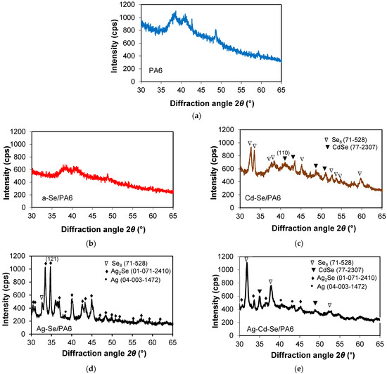 Because the intensities of the diffraction peaks of PA 6 are very high and overlap with the main peaks of the materials inserted/deposited on the polymer, the XRD patterns of the obtained composites were given in the 2θ assortment of 30–65°. As can be seen from Figure 4b, in the a-Se/PA 6 composite, Se formed as a result of reaction (11) is in the amorphous form, i.e., not detected via XRD analysis.
