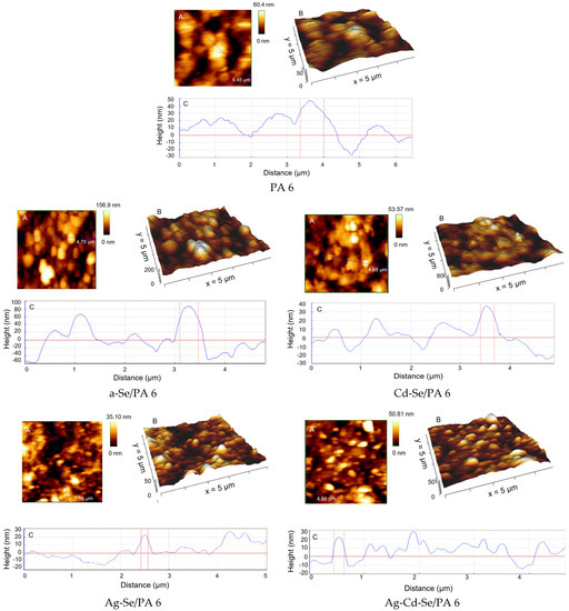 Surface roughness is an important indicator of the quantitative characteristics of the sample surface. Uniform numerical parameters are useful for classifying surfaces from the same type of materials produced by the same method [60]. On a selected small scan area of 5 µm × 5 µm, 2D height data (Figure 5A) and 3D topographic (Figure 5B) AFM images of the respective PA 6 and a-Se/PA 6, Cd-Se/PA 6, Ag-Se/PA 6 and Ag-Cd-Se/PA 6 composites are shown. In particular, 3D images can better visualize the spatial characteristics of PA 6 and obtained composites. Since the composites did not have a pronounced texture but were characterized via complex relief topography, the roughness parameters were calculated from profilograms obtained for different surface areas (Figure 5C). The length of the scan areas was approximately 4.5–6.5 μm. The corresponding measured topographic parameters are collected in Table 3. Z is the maximum height of the surface. Surface roughness (Ra) is defined as the average value of the surface height relative to the central plane, and root mean square (RMS) is defined as the standard deviation of the surface height within a given area. Peak to valley roughness Rt is the vertical height distance between the highest peak and lowest valley of the roughness profile within the overall measuring distance [61].