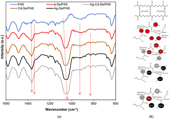 As reported in [20,69], the vibrational mode of CdSe is between 400 and 700 cm−1. The IR absorption spectrum of selenium-rich CdSe nanocrystals shows a peak at 800 cm−1 [70]. The infrared spectra for Ag2Se nanoparticles of various sizes (from 5 nm to 28 nm) display a strong absorbing peak in the mid-IR range from 2100 cm−1 to 650 cm−1. [71]. Thus, it is possible to avoid the problem of overlapping characteristic peaks of metal selenides and PA 6. The IR spectra of the Cd-Se/PA 6, Ag-Se/PA 6 and Ag-Cd-Se/PA 6 composites are very similar to the spectrum of a-Se/PA 6 but show an even greater shift of the peak at 1112 cm−1 to lower frequencies (Table 4) and the presence of another new peak at 877 cm−1. In analogy with data [65], those weak vibrations can be attributed to the CdSe or Ag2Se compounds. Another dimension of the functionality and complexity of inorganic–organic materials is introduced if the selenides are combined with each other. For example, the negative energies of chemical bond formation of CdSe and Ag2Se promote the creation of Ag–Cd–Se interfacial bonds, which lead to non-selective nucleation in Ag2Se/CdSe hetero-nanostructures [72]. Thus, the peak at 1108 cm−1 in the IR spectrum of the Ag-Se/PA 6 composite shifts to 1094 cm−1 in comparison with the IR spectrum of the Ag-Cd-Se/PA 6 composite.